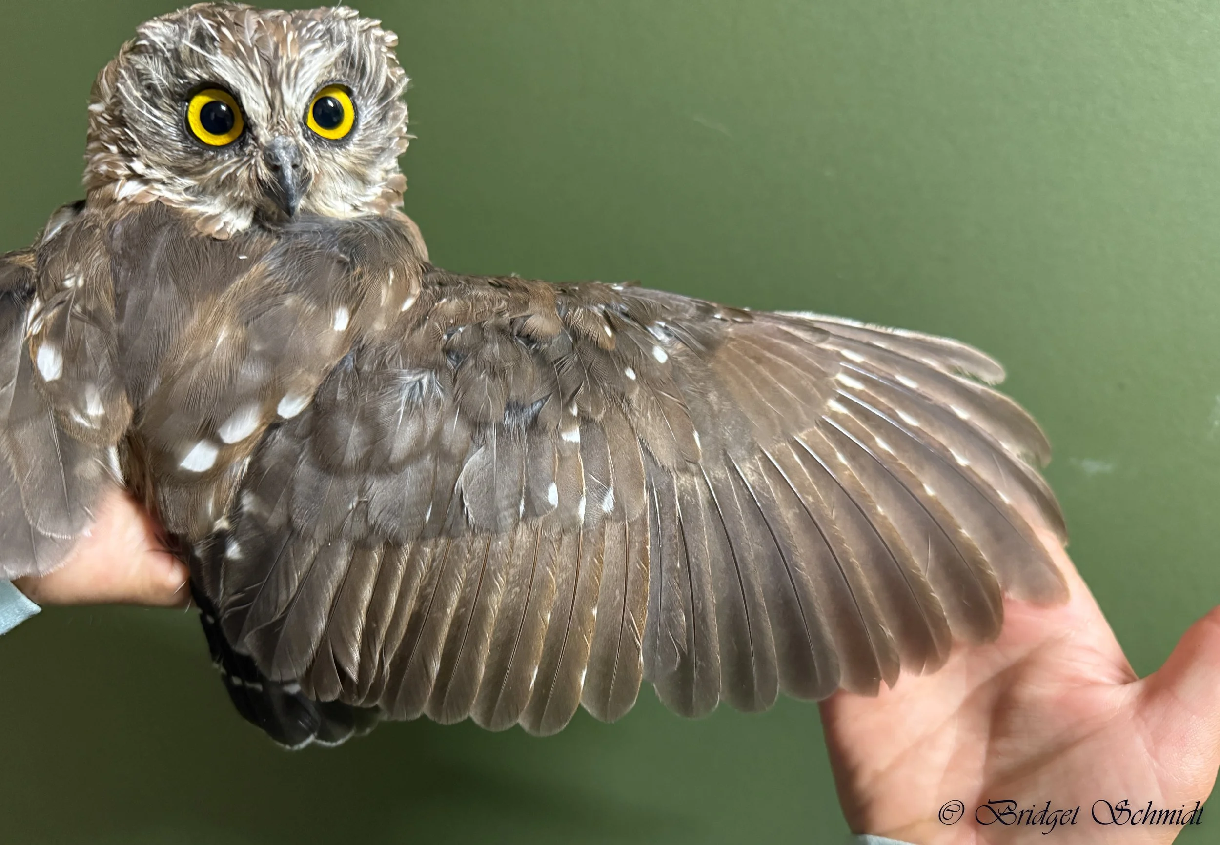 This owl is more than two years old-we can tell from the pattern of new and old feathers on the wing.